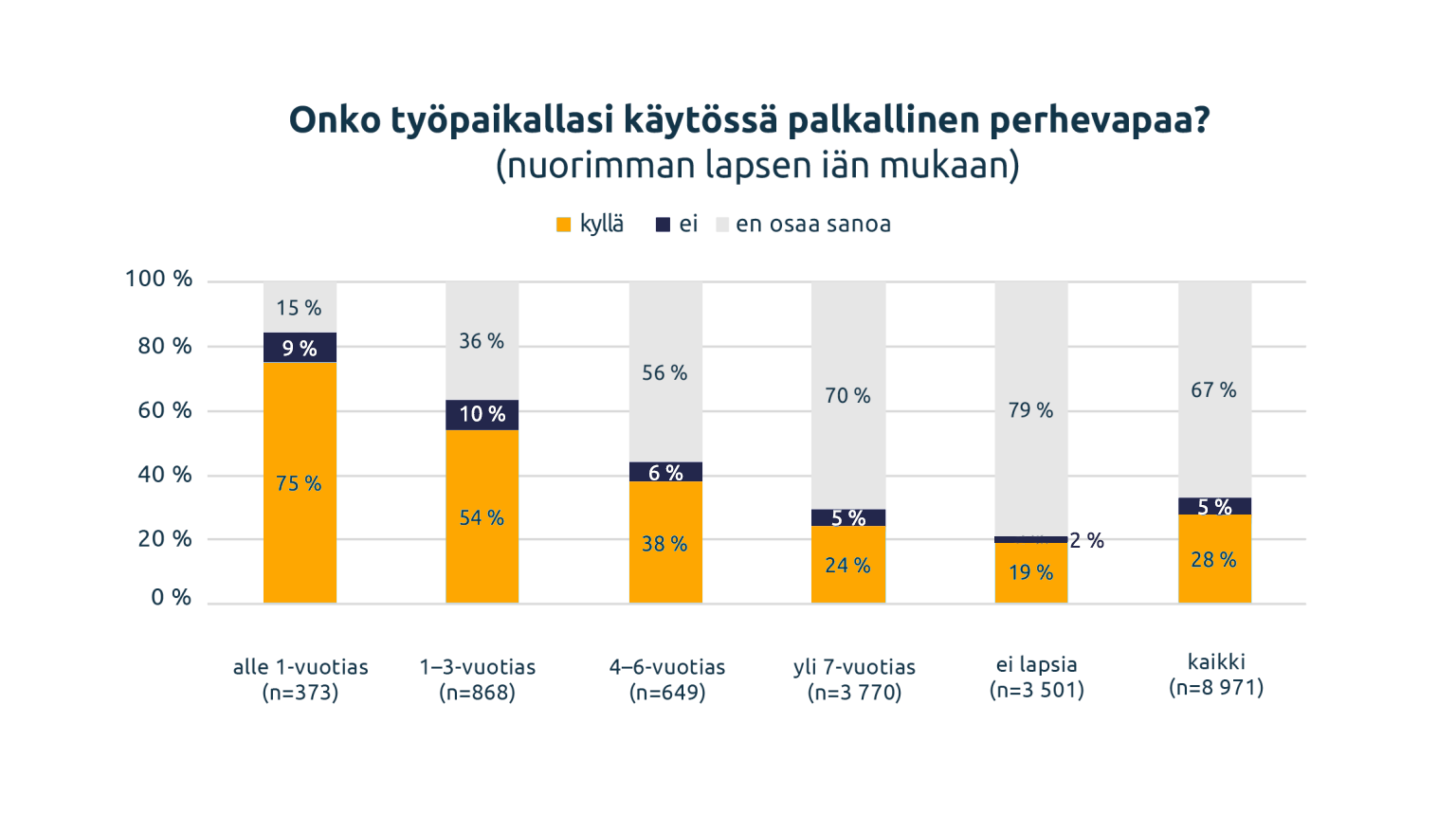 Kaksi kolmesta vastaajasta (67 %) ei osannut arvioida, onko työpaikalla käytössä palkallinen perhevapaa, vain 28 prosenttia kaikista vastaajista vastasi ”kyllä” ja 5 prosenttia ”ei” (kuvio 2). Alle 1-vuotiaiden lasten vanhemmista 75 prosenttia ilmoitti, että työpaikalla on palkallinen perhevapaa, kun taas 1–3-vuotiaiden lasten vanhemmista näin vastasi reilu puolet (54 %). Lapsettomista vastaajista valtaosa (79 %) ei osannut ottaa kantaa.