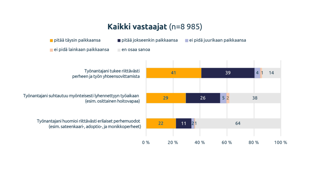 Hieman yllättävänä voidaan pitää sitä, että pienten lasten vanhemmat ovat yhtä epätietoisia kuin muutkin, kun kyseessä on erilaisten perhemuotojen huomiointi. Esimerkiksi alle 1-vuotiaiden lasten vanhemmista vajaa kolmannes (31 %) uskoo, että työnantaja huomioi riittävästi erilaiset perhemuodot, kolme prosenttia on eri mieltä, mutta enemmistö (66 %) ei osaa ottaa kantaa.