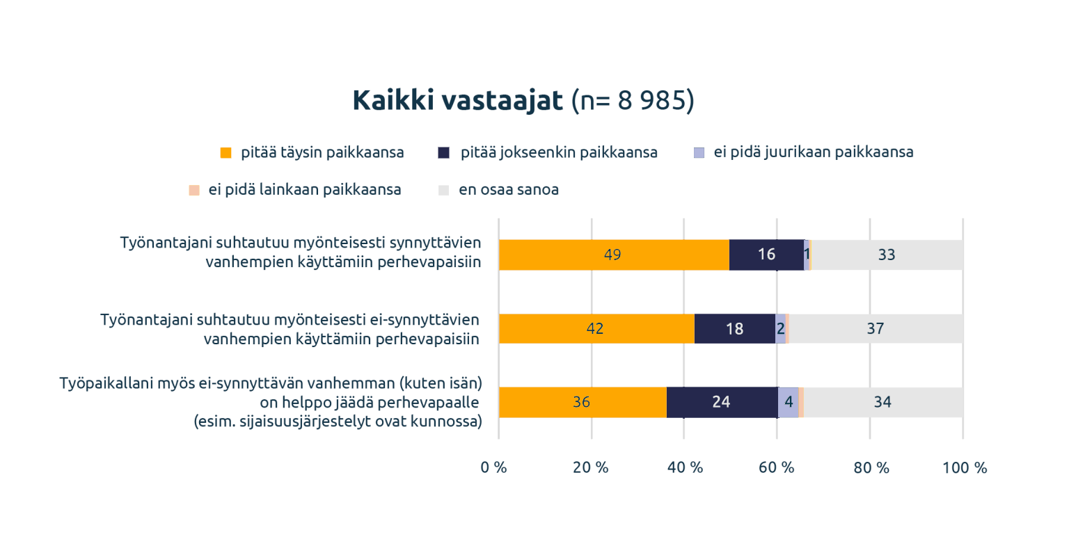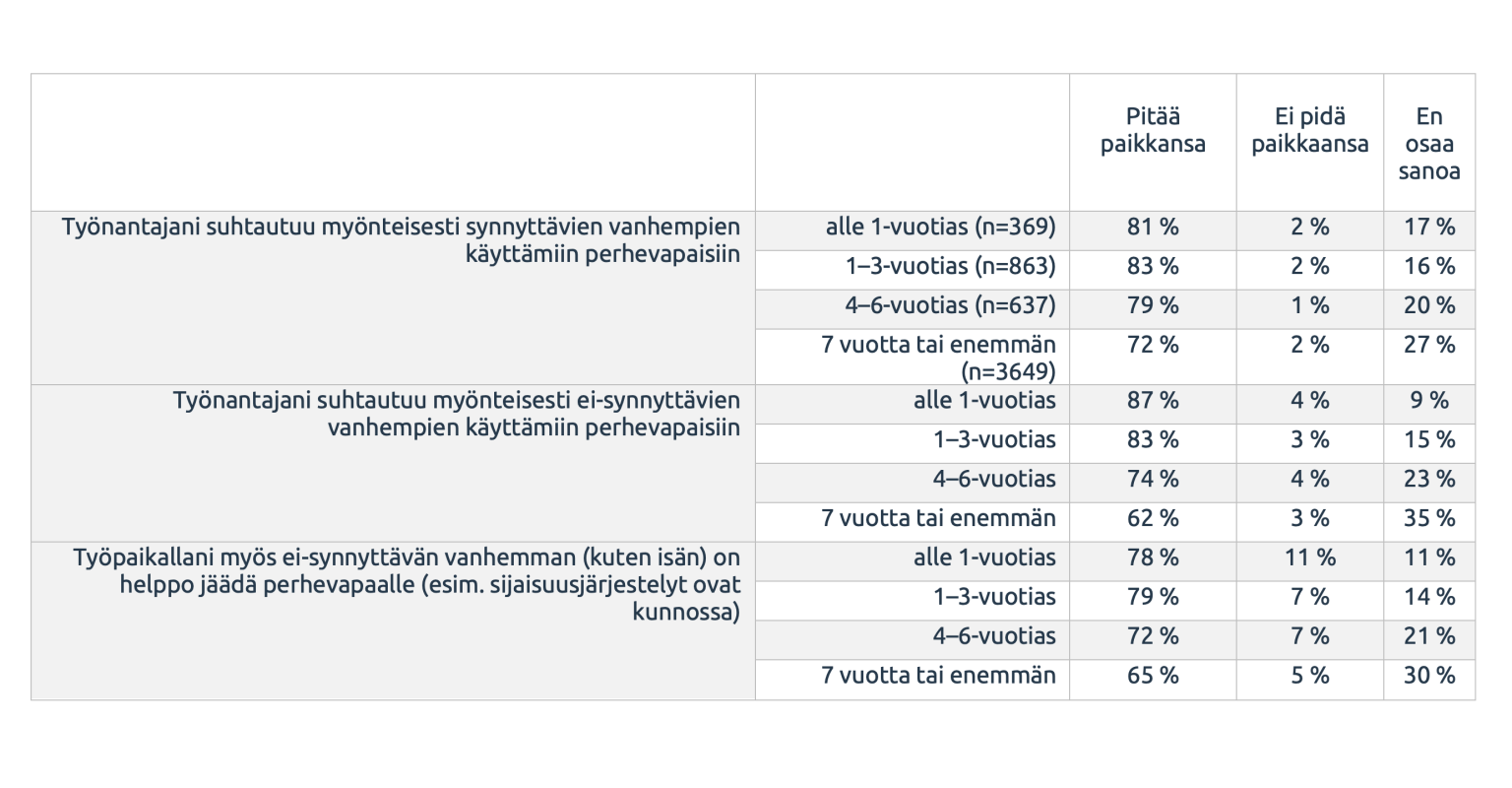 Toisaalta jokseenkin huolestuttavaa on, että nuorimpien lasten vanhemmat useimmin arvioivat, että ei-synnyttävän vanhemman ei ole helppoa jäädä perhevapaalle. Avoimissa kommenteissa vastaajat nostivat esiin muun muassa haasteita sijaisjärjestelyissä, jotka saattoivat koskea myös synnyttäviä vanhempia. Lisäksi työnantaja tai esihenkilöt voivat suhtautua eri tavoin synnyttävien ja ei-synnyttävien vanhempien vapaisiin.