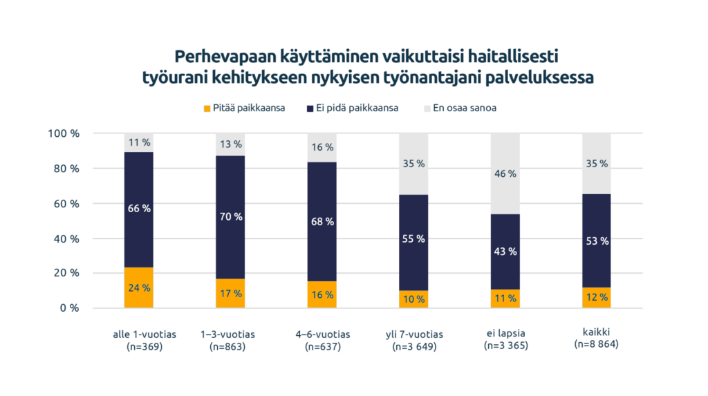 Kaikista vastaajista 12 prosenttia arvioi, että perhevapaan käyttö vaikuttaisi haitallisesti työuraan nykyisellä työnantajalla (kuvio 5). Eri mieltä väittämän kanssa on reilu puolet vastaajista (53 %), kun 35 prosenttia ei osaa ottaa kantaa. Perhevapaan käytön haitallisuuden arviointi on vaikeinta lapsettomille vastaajille, mitä voidaan pitää luontevana.