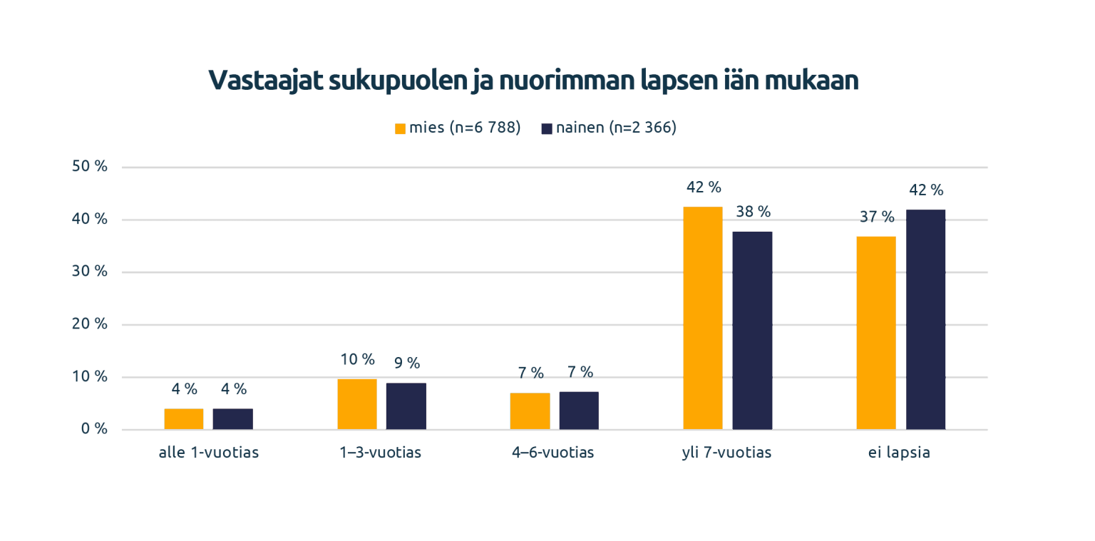 Perhevapaajärjestelmän uudistus oli tuttu 42 prosentille kaikista vastaajista (kuvio 1). Uudistuksesta tietäminen vaihteli kuitenkin huomattavasti vastaajan nuorimman lapsen iän mukaan, mikä on hyvin ymmärrettävää. Kun alle 1-vuotiaiden lasten vanhemmista miltei kaikki (97 %) vastasivat tietävänsä uudistuksesta, lapsettomista vastaajista näin teki joka kolmas (33 %). Mikäli nuorin lapsi on kouluikäinen tai vanhempi, hieman reilu kolmannes (35 %) kertoi tietävänsä uudistuksesta.