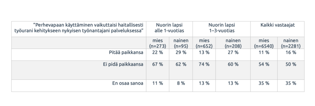 Huolestuttavaa on, että alle 1-vuotiaiden lasten vanhemmista joka neljäs (24 %) arvioi perhevapaan käyttämisen vaikuttavan haitallisesti urakehitykseen. Vaikka eri mieltä on kaksi kolmesta (66 %) pienimpien lasten vanhemmista, on samaa mieltä olevien osuus merkittävä. Kun otetaan vielä huomioon vastaajan sukupuoli, miehistä 22 prosenttia ja naisista peräti 29 prosenttia arvioi perhevapaan käytön vaikuttavan kielteisesti urakehitykseen (taulukko 3).
